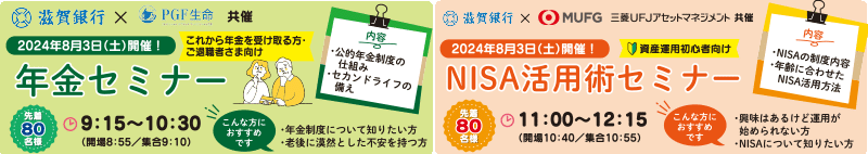 当行では2024年8月3日(土)に『年金セミナー』・『NISA活用術セミナー』を開催します。