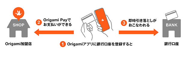 - Origami Payアプリでは、事前に登録されたクレジットカードや銀行口座からの支払、引落が可能。