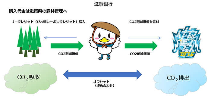 当行は「琵琶湖の水質保全と地域振興」という同フェスが掲げるテーマに賛同し、寄付スキーム「未来よし+(プラス)」(※2)を通じて、びわ湖カーボンクレジット(※3)30t-CO2を提供します。これにより、会場で使用される電力や、会場と最寄り駅を結ぶシャトルバス等の運行によって排出されるCO2が相殺されます。また、開催当日には、当行職員がボランティアとして、運営に一部協力します。
