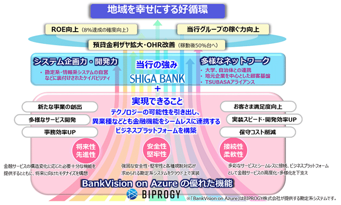 - (2)「BankVision on Azure」は勘定系のオープン化とクラウド化を同時に実現でき、さらに当行の強みである「システム企画力・開発力」と、「多様なネットワーク」を掛け合わせることで、企業価値を高め、将来的には、OHR改善(50%台)、ROE向上(8%)の実現を目指します。