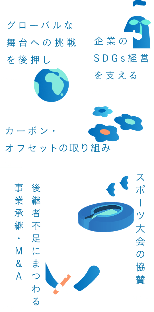 企業のSDGsへの取り組みを金融面・非金融面の両面から支援しています。脱炭素や地域資源の活用、働き方改革など、持続可能な経営の実現に向けて、企業とともに歩みながら、社会課題の解決と経済成長の両立を後押ししています。