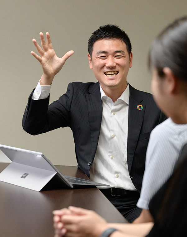 面接を通じて、働きやすい社風と先輩方の人柄の良さに惹かれました。また、地域に根づき、多くの経営者と関われることに魅力を感じたことも入行理由です。私は支店勤務が長く、日々のお客さまとの出会いを通じて学びと自己成長、地域経済への貢献を実感しています。滋賀県外での新規開拓に苦労した時期もありましたが、経営者であるお客さまに直接手紙を書き、自分の想いを伝えて成約につながったことは、今でも鮮明に覚えています。